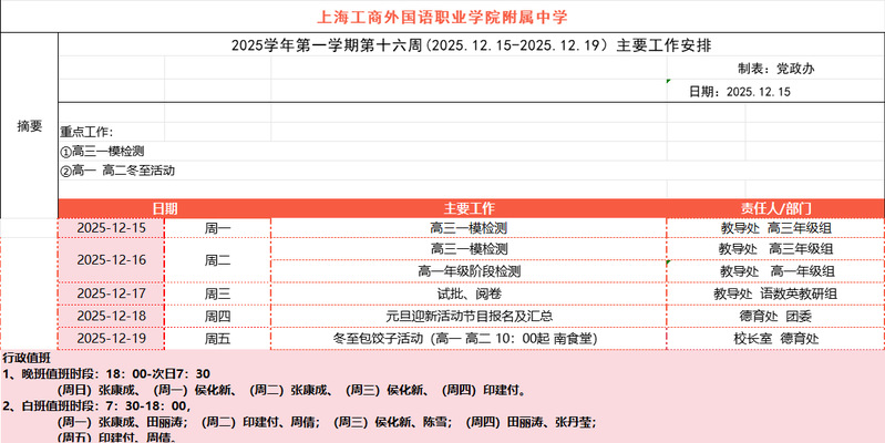 2025学年第一学期第16周主要工作安排